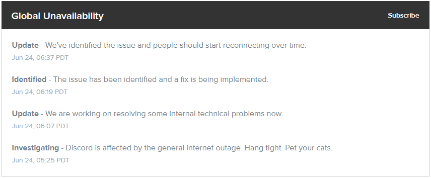 한국시간 6월 24일 약 오후 9시경, 음성채팅 프로그램인 디스코드의 서비스 이용에 장애가 발생했다. 일반 사용자 부터 많은 게이머가 사용하는 음성채팅 프로그램의 장애로 인하여 많은 사람들이 불편을 겪는 것은 물론 경기 중인 e스포츠 리그까지 중단되는 상황이 발생했다.