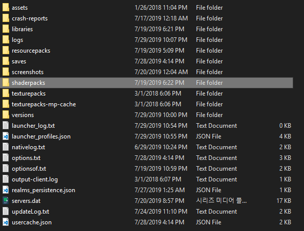 그럼 shaderpacks 폴더가 보이게 됩니다. 들어가 줍니다.
