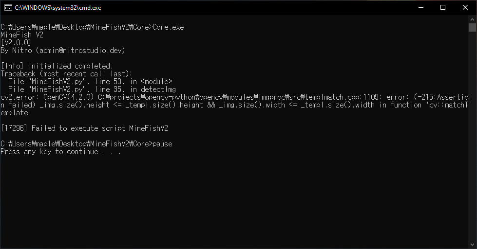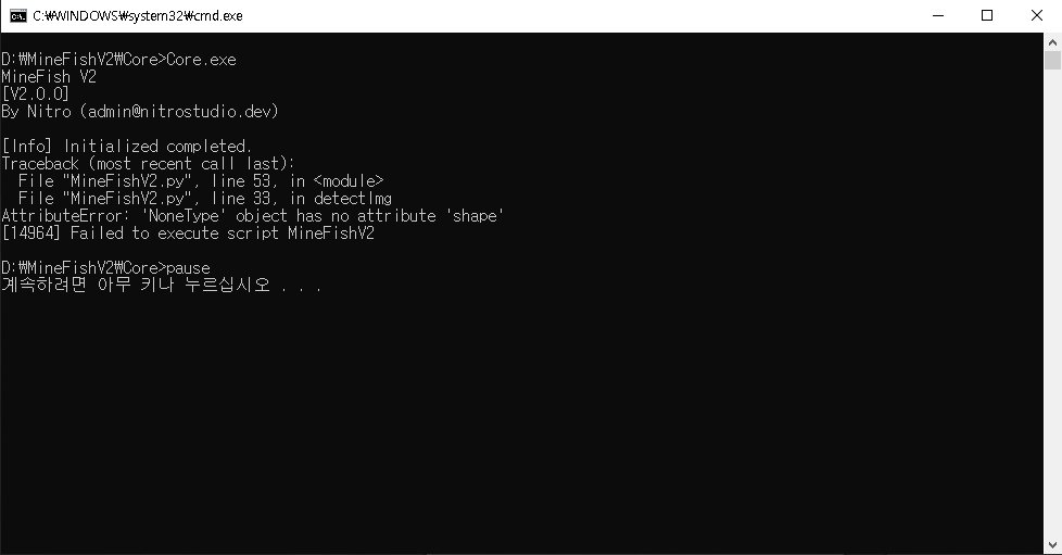 MineFish 프로그램에서 Start를 눌렀을 때, 검은 창이 잠시 나타났다가 사라질 경우: