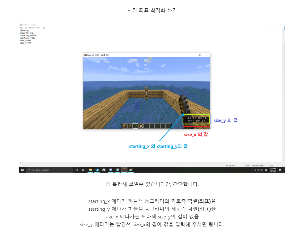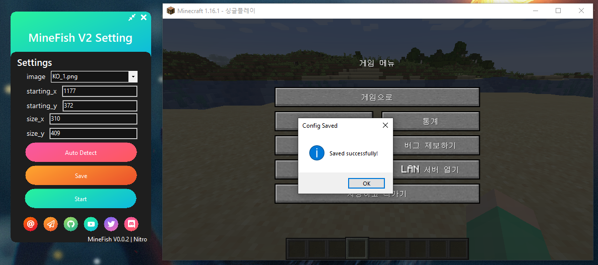 2) 마인크래프트의 위치가 변경되면 안 됩니다. 창 위치가 변경될 경우, 검은색 창을 닫아주시고, 다시 Auto Detect - Save - Start 순으로 프로그램을 실행시켜 주세요.