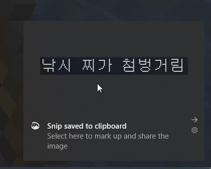 지금 보는 것과 같이 물고기가 찌를 무는 순간 윈도우 쉬프트 S키를 동시에 눌러줍니다. 그러면 이러한 검은색 오버레이가 뜨며 마우스가 십자가 모양으로 변경되는데요, 해당 '낚시 찌가 첨벙거림' 문구를 드래그하여 복사해 줍니다.
