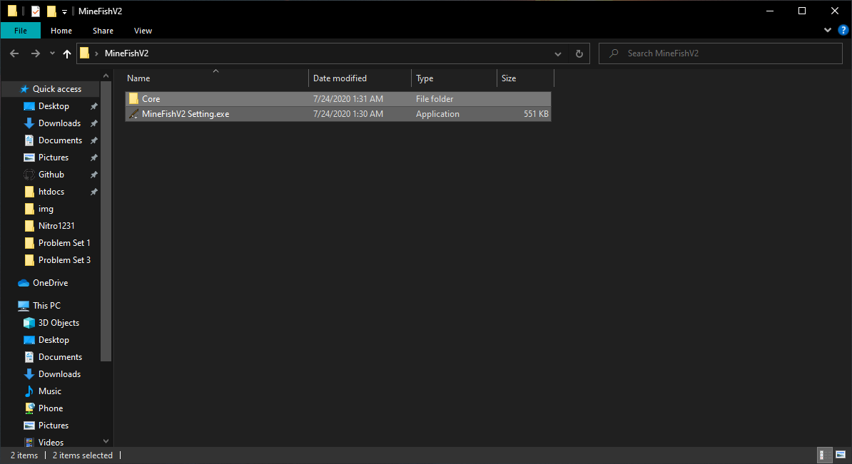 일단 다운받으신 폴더를 열어보시면 보시는 것과 같이 MineFishV2 Setting 프로그램과, Core 폴더가 있습니다. 주된 작업은 Setting 프로그램에서 진행하게 될 것입니다.