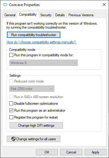 Core 폴더안 Core.exe의 속성창에 들어가셔서 이 프로그램을 관리자 권한으로 실행에 채크해주세요!