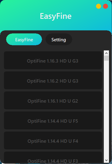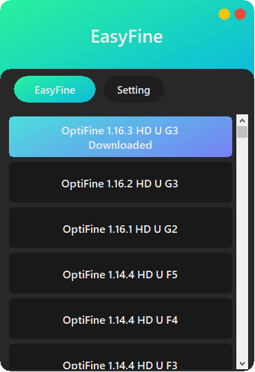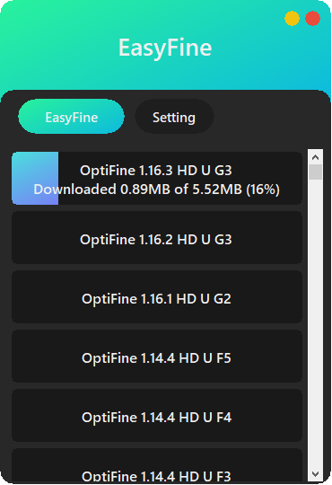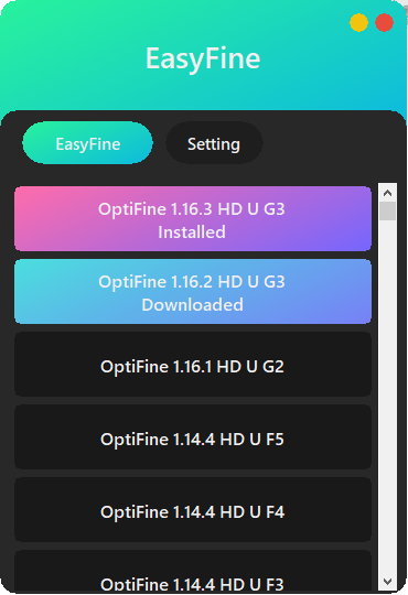 EasyFine은 옵티파인을 정말 손쉽게 설치 & 관리할 수 있도록 도와주는 유틸입니다. 옵티파인이 지원하는 모든 버전(마인크래프트 1.16.3 버전 포함)을 손쉽게 다운로드 받을수 있습니다.