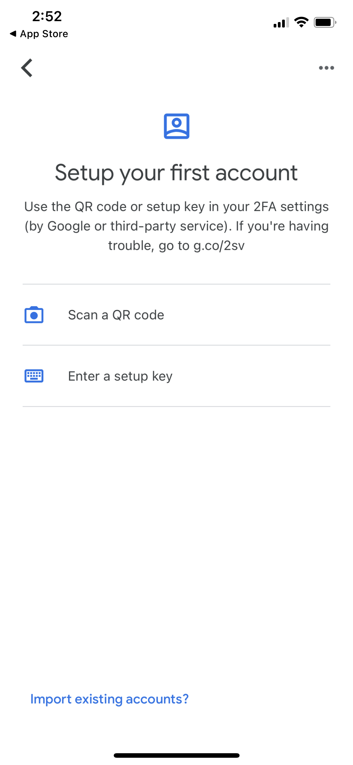 그러면 위와 같은 화면이 나오게 될 텐데, Scan QR code나 Enter a setup key를 눌러서 아까 콘솔에 나와있던 정보를 입력합니다.