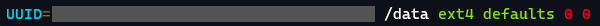 UUID=<UUID 입력> <마운트할 위치> ext4 defaults 0 0