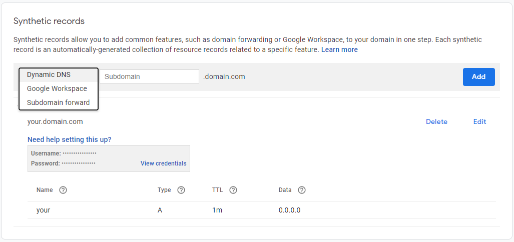 이어서 Synthetic records 부분을 찾아서, Subdomain forward라고 되어있는 드롭박스를 눌러 Dynamic DNS를 선택해 줍니다.
